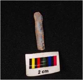 | Description / विवरण | A blade with a mid-ridge on dorsal triangular section, diffused bulb on ventral use-wear marks along the cutting edges, distal end broken and raw material was given heat treatment. |