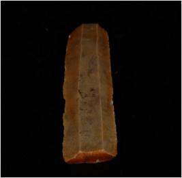 | Description / विवरण | Fragment of chert parallel sided blade with two ridges on dorsal, trapeziodal section and use wear marks on edges. |