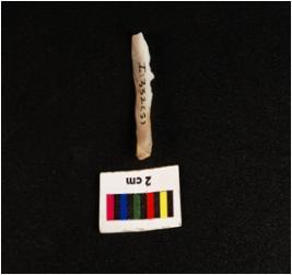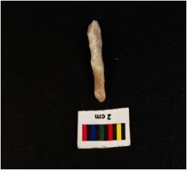 | Description / विवरण | Parallel sided blade with prominent wavy mid ridge on dorsal triangular in section, broken at distal end, diffused bulb on ventral and use wear mark along the cutting edges. |