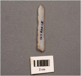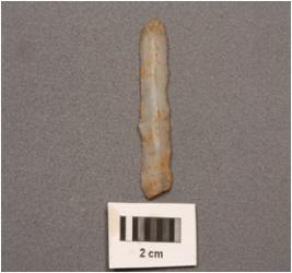 | Description / विवरण | Parallel-sided microlith blade with double ridges on dorsal, trapezoidal in section, bulb on proximal end and use-wear marks on cutting edges. |