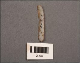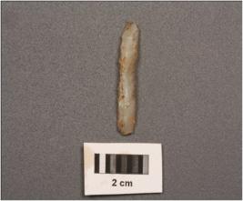 | Description / विवरण | Parallel sided microlithic blade with improminent mid ridge on dorsal, bulb on ventral and blunt edge on right dorsal. |