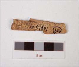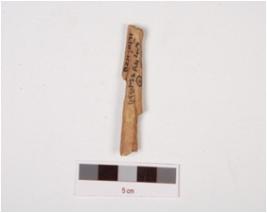 | Description / विवरण | Fragment of bone arrow head, oval section, cut marks on surface and rough surface, brown in colour. |