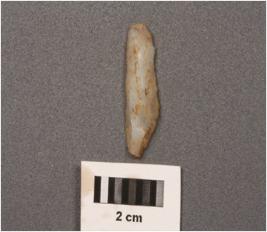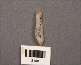 | Description / विवरण | Chalcedony parallel sided blade with a flake scars on dorsal side, broken from proximal end, regularly retouched from one side. |