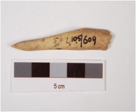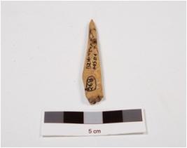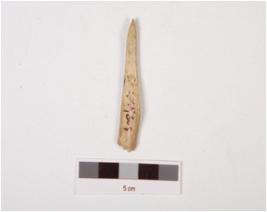 | Description / विवरण | Fragment of bone point, pointed top, broad bottom, groove channel inside, polished surface and off white in colour. |