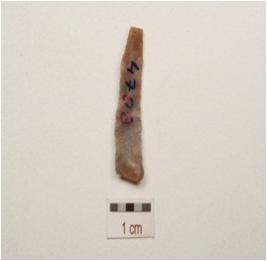| Description / विवरण | A chert blade with a single ridge on dorsal, diffused bulb on ventral, triangular in section, use wear marks on cutting edge and broken along distal end. |
