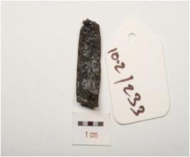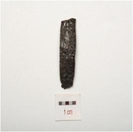 | Description / विवरण | Fragment of iron chisel, broken on both end, chemically treated surface and thin in section. |