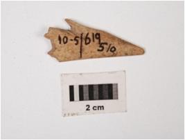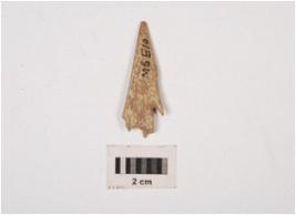 | Description / विवरण | Fragment of bone arrow head, pointed top, segmented uneven end, flat surface, polished and off white in colour with stains. |
