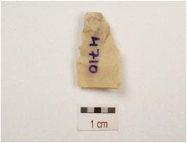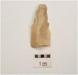 | Description / विवरण | Fragment of chert blade with single ridge on dorsal, triangular in section, diffused bulb on ventral, use wear marks on cutting edge and broken along distal end. |