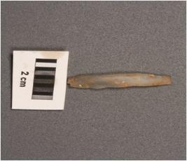 | Description / विवरण | Chalcedony parallel sided blade with flaking from dorsal surface, triangular section, sharp edges. |