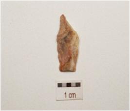 | Description / विवरण | A chert blade with single ridge on dorsal, triangular in section, use wear marks on cutting edge, pointed towards distal end and broken along proximal end. |