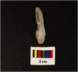 | Description / विवरण | A microlithic point with two ridges on dorsal , diffused bulb on ventral , broken at right dorsal side and distal end with triangular in section. |