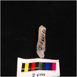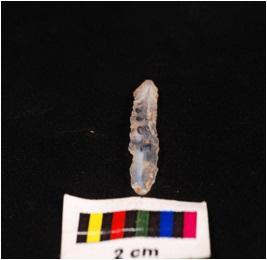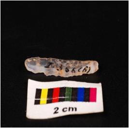 | Description / विवरण | Parallel sided blade of chalcedony with mid-ridge on dorsal triangular section, diffused bulb on ventral and use-wear marks on the cutting edges. |