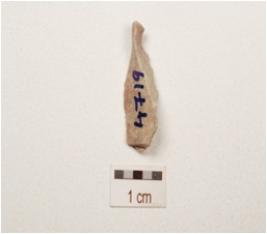 | Description / विवरण | A chert blade with a mid ridge on dorsal, triangular in section, diffused bulb on ventral, use wear marks on cutting edge and broken along distal end. |