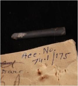 | Description / विवरण | Polished stone nail with missing head and pointed end. |