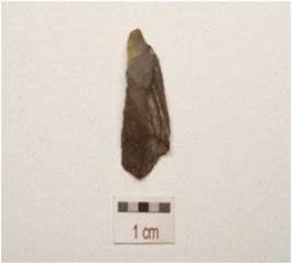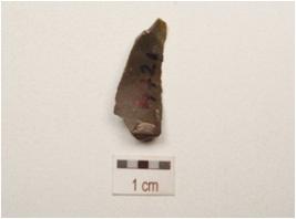 | Description / विवरण | A chert blade with a mid ridge on dorsal, triangular in section, use wear marks on cutting edge and slightly broken along distal end. |