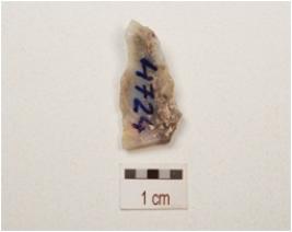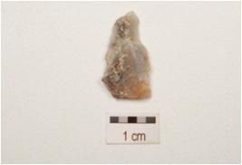 | Description / विवरण | A chert blade with improminent single ridge, pointed distal end, triangular in section, broken along proximal end and use wear marks on cutting edge. |
