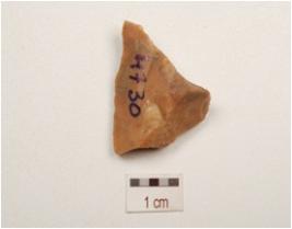 | Description / विवरण | A end struck utilized flake, diffused bulb on ventral, prepared platform, triangular in section and use wear marks on edges. |
