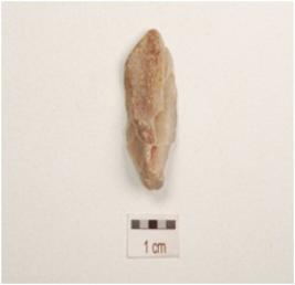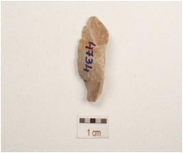 | Description / विवरण | A end struck utilized flake made on chert with a ridge on dorsal, triangular in section, prepared platform and use wear marks on edges. |
