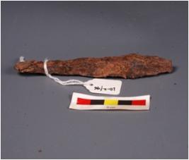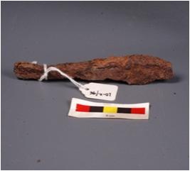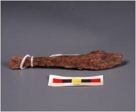 | Description / विवरण | Broken piece of iron plough, one end is flat and sharp other end broad and thick, probably used for agriculture purpose, surface is rusted. |