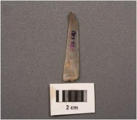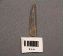 | Description / विवरण | Microlith point made of chalcedony with double ridge on dorsal, pointed end and trapezoidal in section. |
