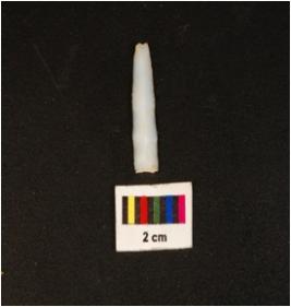 | Description / विवरण | Parallel sided chalcedony blade, two-ridges on dorsal, flat ventral and use wear edges. |