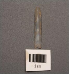 | Description / विवरण | Microlithic blade with improminent mid ridge on dorsal, diffused bulb on ventral end and use wear marks on cutting edges. |