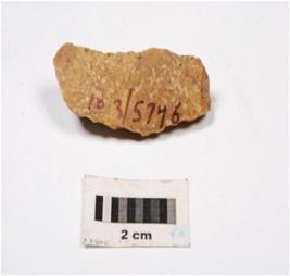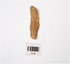 | Description / विवरण | Parallel sided chert blade, ridge on ventral, irregular edges, use-wear marks, defused bulb on proximal end, yellow in colour. |