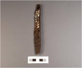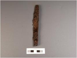 | Description / विवरण | Iron knife with a sharp working edge, opposite side flat with a triangular cross section, pointed end and part of handle visible. |