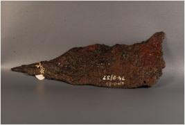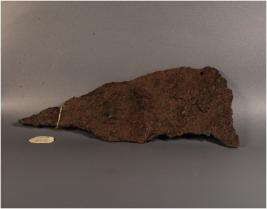 | Description / विवरण | Iron chopper with a pointed end on handle side and a curver on the other end, corroded flat surface. |