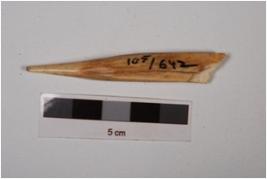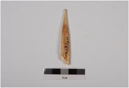 | Description / विवरण | Fragment of a bone point, pointed top, off white in colour, grooved line on the surface and polished surface. |