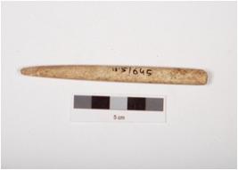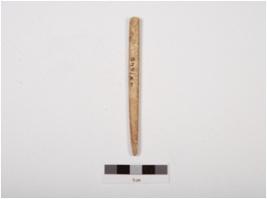 | Description / विवरण | A fragment of bone point, both ends are uneven sections, round thick surface, polished and off white in colour with stains. |