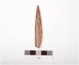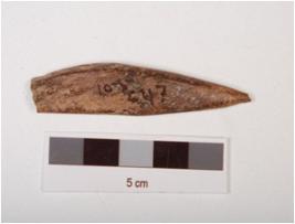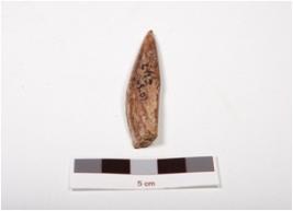 | Description / विवरण | Fragment of bone point, pointed top but chipped off, broad from bottom, channel rough surface and polished brown in colour. |