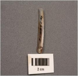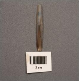 | Description / विवरण | Chalcedony blade, mid ridge on dorsal side, use wear edges, broken distal end and bulb on ventral. |