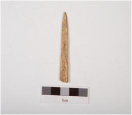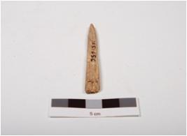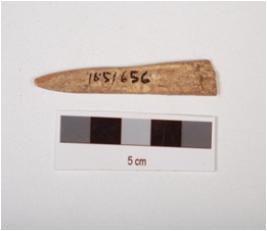 | Description / विवरण | Fragment of bone point, broken top, broad from middle and rough surface. |