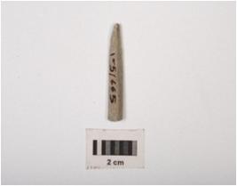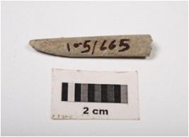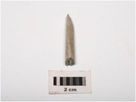 | Description / विवरण | Fragment of stone point, pointed top but slightly chipped off, triangular section, rough surface and grey in colour. |
