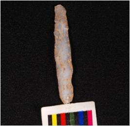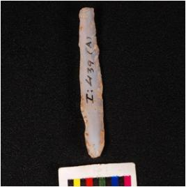 | Description / विवरण | Parallel sided blade, made of on chalcedony stone, mild ridge on dorsal ventral is smooth with prominent bulb and use wear marks on edge. |
