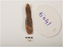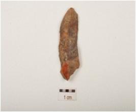 | Description / विवरण | A blade made on chert mid ridge on dorsal side, bulb of percussion on ventral prepared platform on proximal end and partly use ware on cutting edges. |