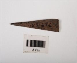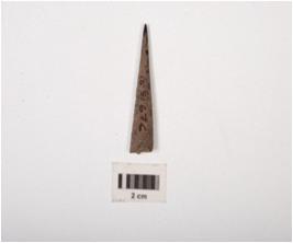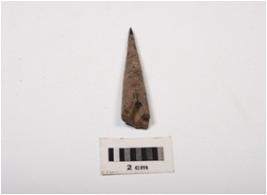 | Description / विवरण | Fragment of stone point, pointed top and polished, round in slightly painted from top and black in colour. |