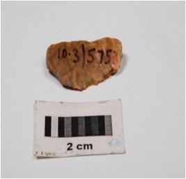 | Description / विवरण | Knife shaped chert blade, mid-ridge on ventral, use wear marks on edges, distral top, defused bulb on proximal end, yellow in colour. |