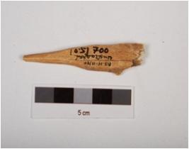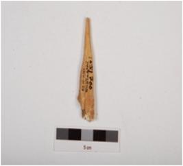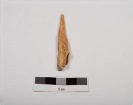 | Description / विवरण | Fragment of bone point, broken top, segmented uneven end, cracks on surface, channel inside, polished and off white in colour. |