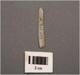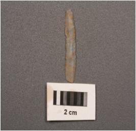 | Description / विवरण | Parallel sided microlithic blade with double ridges on dorsal, trapezoidal section and use wear marks on cutting edges. |