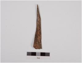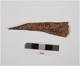 | Description / विवरण | Fragment of a bone point, black in colour, pointed working edge and pointed one end. |