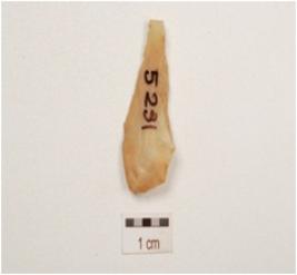 | Description / विवरण | A chert blade with a ridge on dorsal side, striking platform, diffused bulb on ventral side, broken along at distal end and use wear marks on cutting edge. |