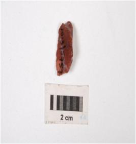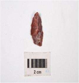 | Description / विवरण | Knife shaped chert blade, ridge on ventral, use-ware marks on edges, distral end, defused bulb on proximal end, red in colour. |
