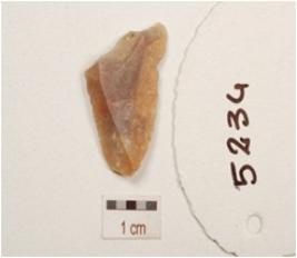| Description / विवरण | Chert blade with two ridges on dorsal side, striking platform, chipped off bulb on ventral side, broken along distal end, partly cortex visible on dorsal side and trapezoidal in section with use wear marks on cutting edges. |