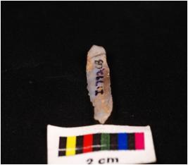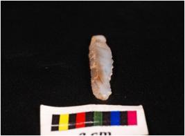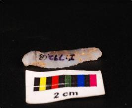 | Description / विवरण | Parallel sided blade of chalcedony with a singel ridge on dorsal triangular section, diffused bulb on ventral and use-wear marks on the cutting edges. |