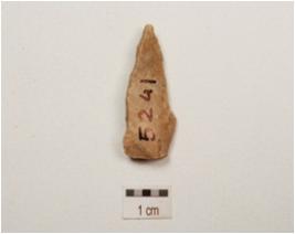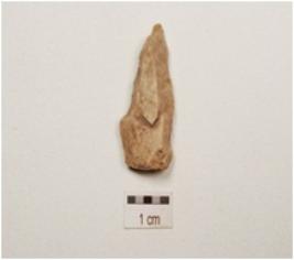| Description / विवरण | Chert blade with two ridges on dorsal side, prepared platform, diffused bulb on ventral side, pointed along distal end, irregular retouches on cutting edges and partly trapezoidal in section. |