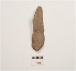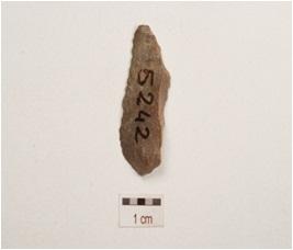 | Description / विवरण | Chert blade with a ridge on dorsal side, prepared platform, diffused bulb on ventral side, use wear marks on cutting edge and partly triangular in section. |