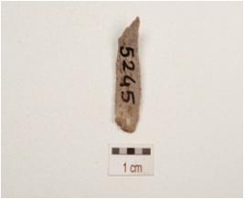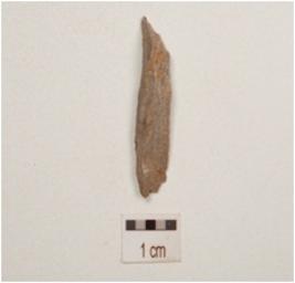 | Description / विवरण | Chert blade with two ridges on dorsal side, striking platform, pointed along distal end, use wear marks on cutting edges and partly trapezoidal in section. |