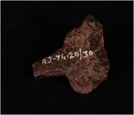 | Description / विवरण | Fragment of iron spear head with flattened section, tanged, upper part broken. Rusted and chemically treated. |